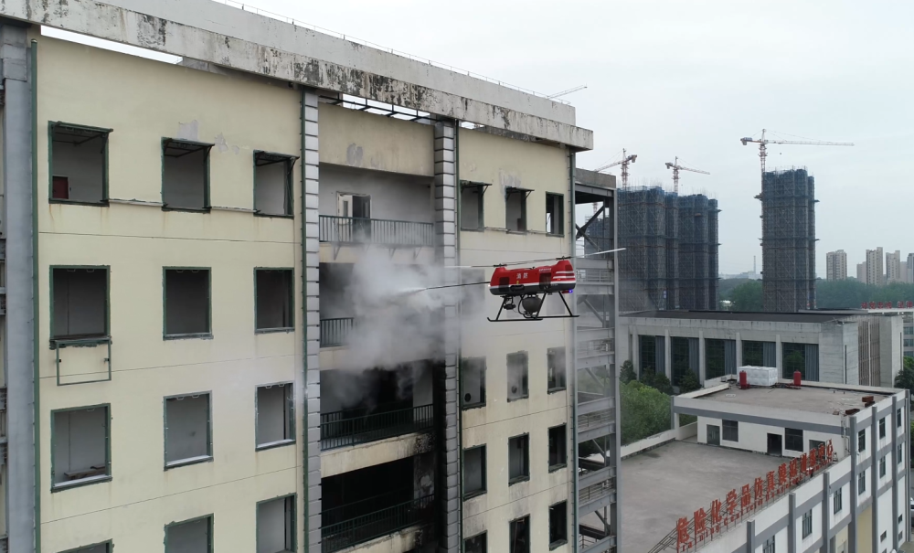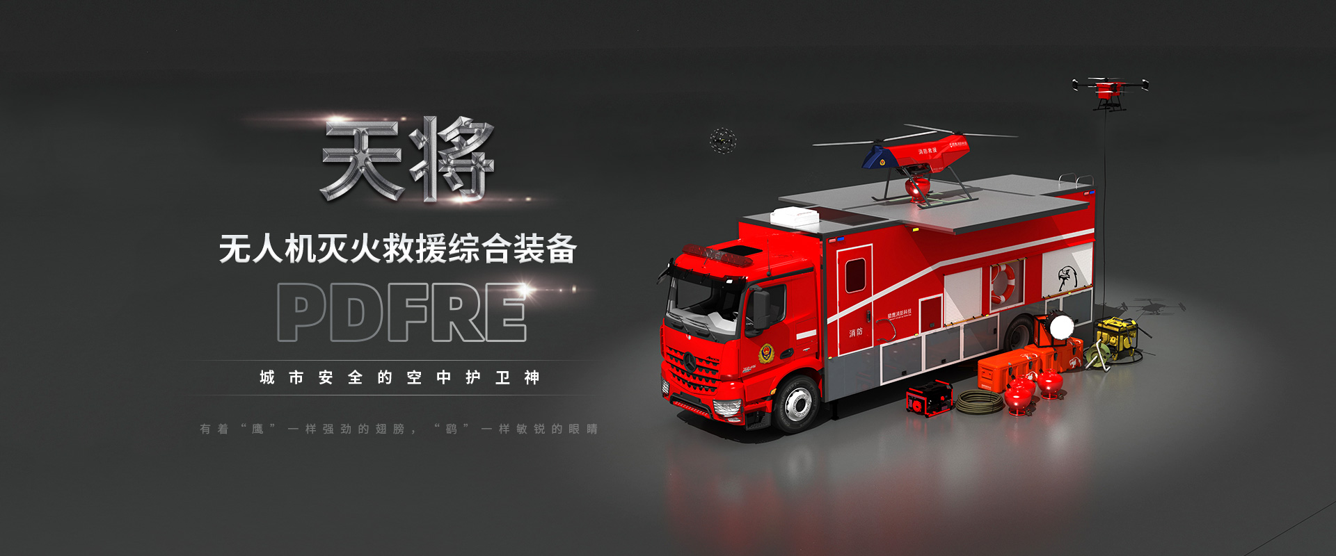 天將是2017年企業承擔的原公安部消防局《旋翼無人機在滅火搶險救援領域中的應用》科技創新項目的研發成果。以大載荷無人機為平臺,集成高效滅火救援模塊和承載運輸車輛,具備高層建筑滅火救援功能和常規應急救援功能。通過無人機噴射高效滅火劑,對高層建筑初期火災可全方位實施精準撲救或快速壓制,為高層建筑滅火提供了一種新的技術手段,實現了高層建筑室外空間滅火技術的創新和突破。
